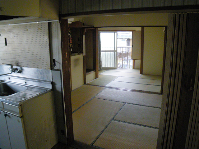 小さく区切られた台所と畳の間。暗く使い勝手も大変でした。